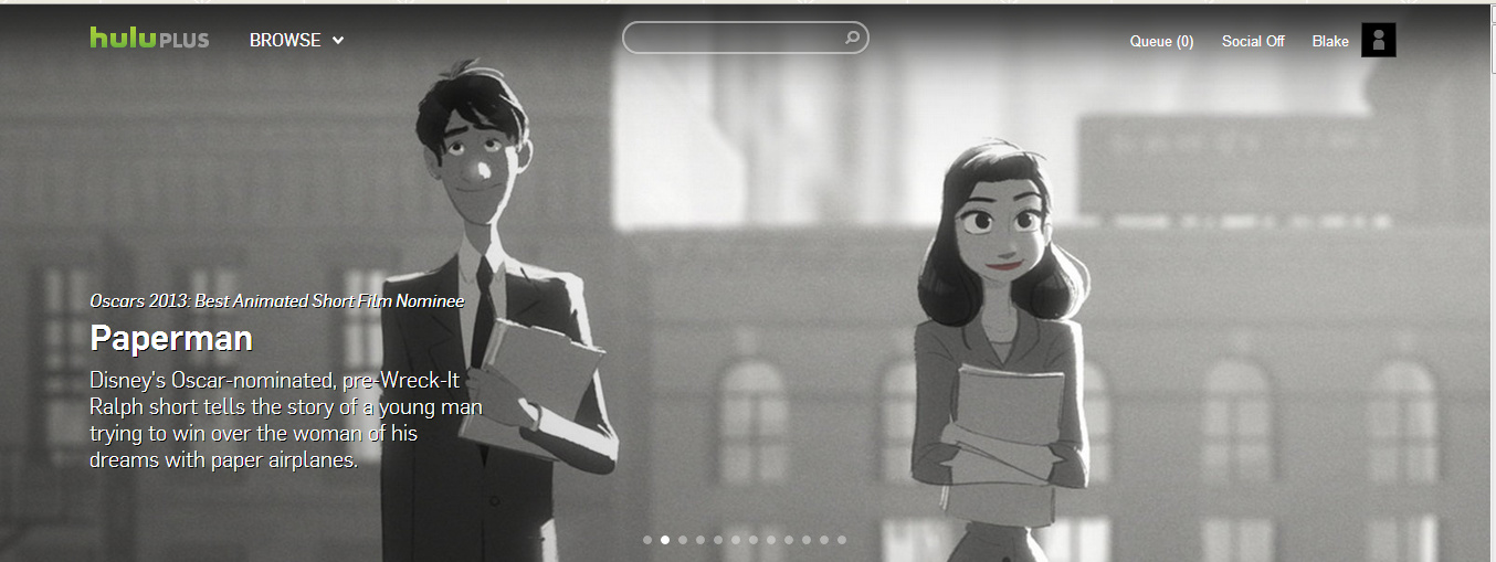 Disney is doing a fair job of promoting Paperman for those who didn’t see Wreck-It Ralph (or maybe just want to see the short again). On Valentine’s Day, it was prominently displayed on Hulu’s homepage, pictured above, for all to see, just as much in the spotlight as the newest episodes of Modern Family and American Idol.