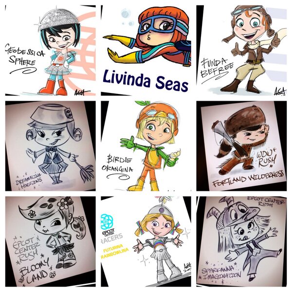 Inspired by the “Sugar Rush” game from Wreck-It Ralph, the trio individually sketched and posted concepts for “Sugar Rush”-type racers, but with an Epcot theme. Characters emerged like Livinda Seas (based on The Living Seas), Sparkanna Imagination (based on the song “One Little Spark” from the Imagination pavilion), and others. What was at first known as “Epcot Center Rush” was soon deemed “WDW Rush” as drawings expanded to include themes from other areas of Walt Disney World like Adventureland and Fort Wilderness. Pretty soon, others in the Twitterverse were also contributing their doodle ideas.