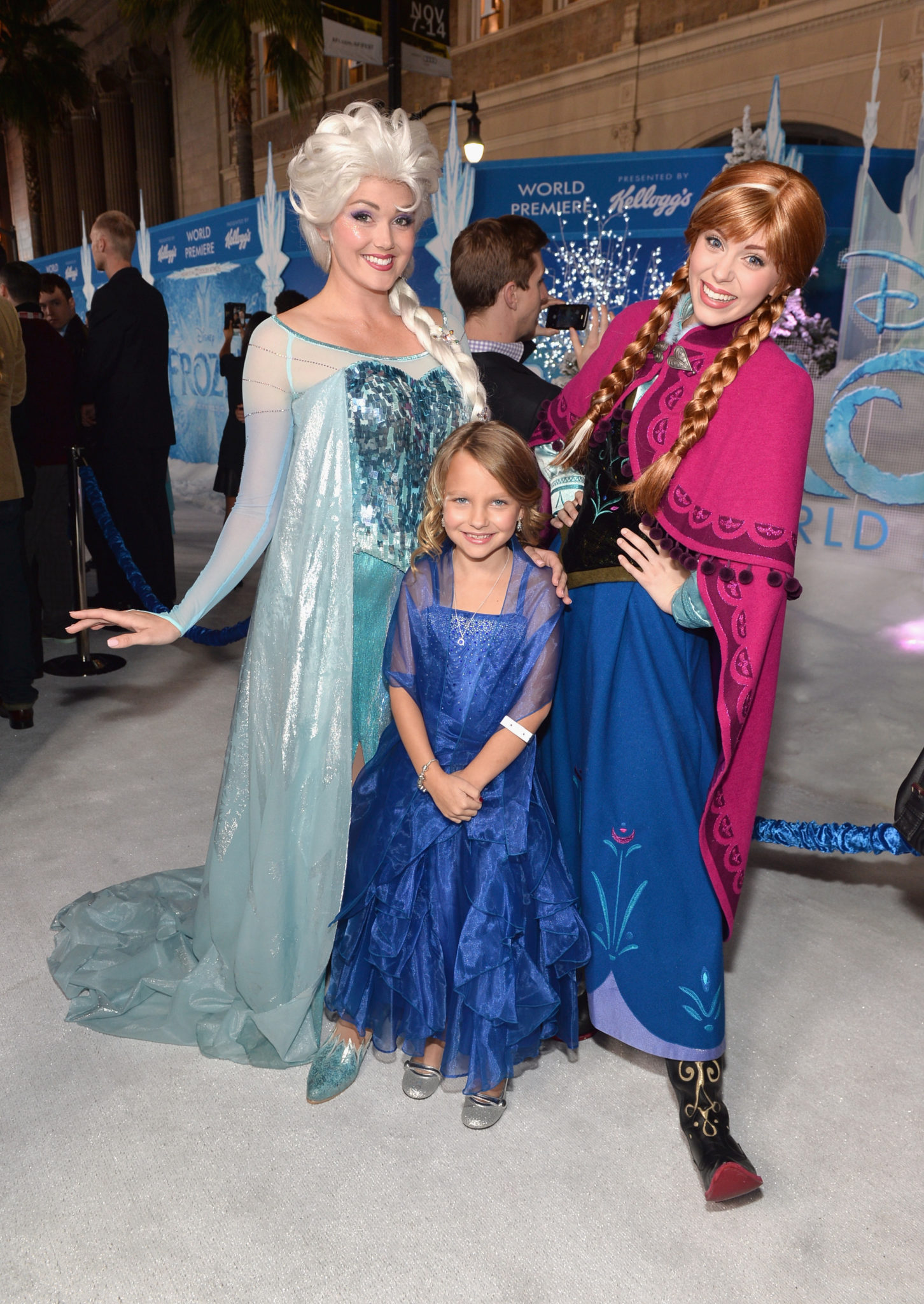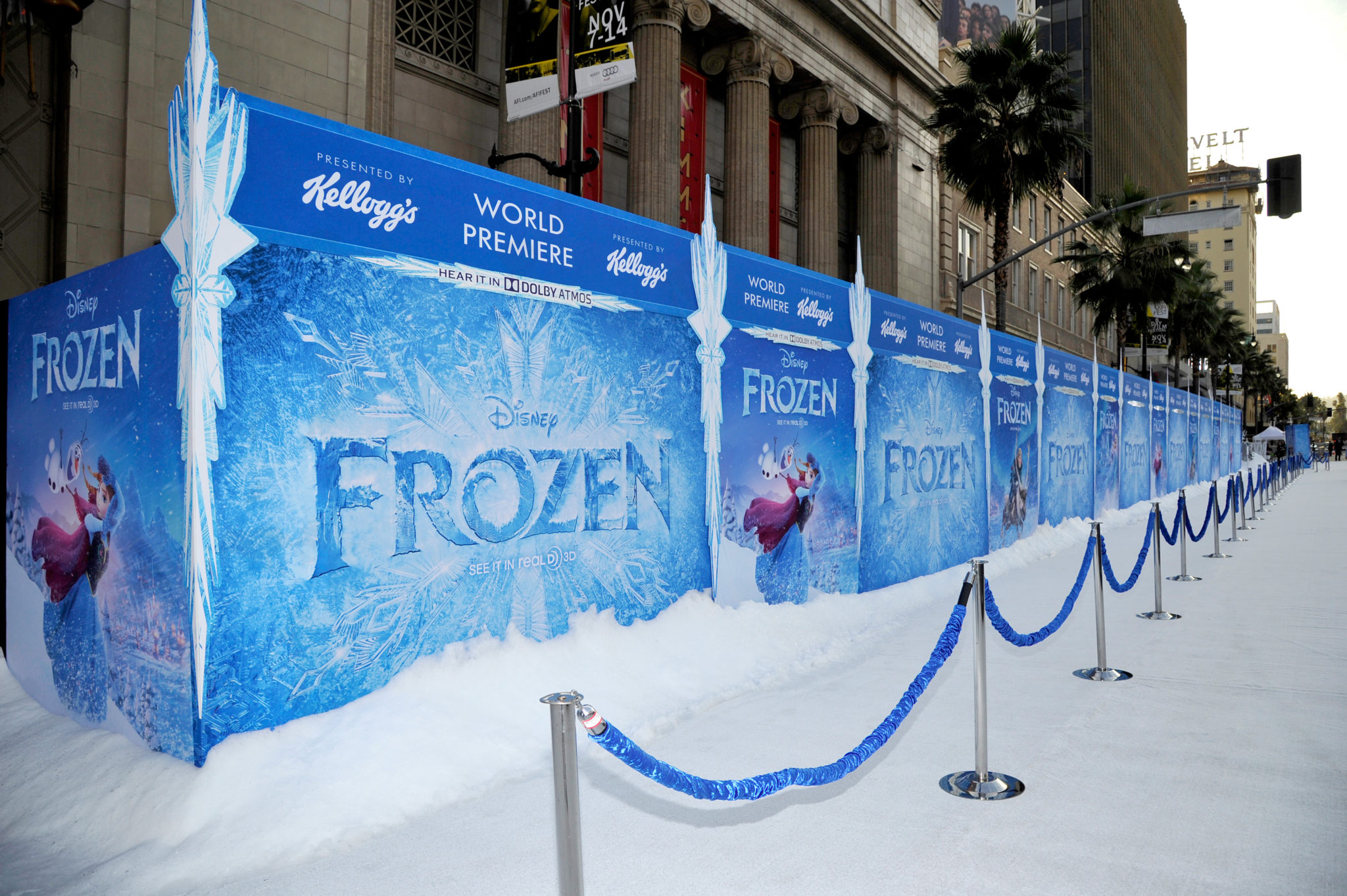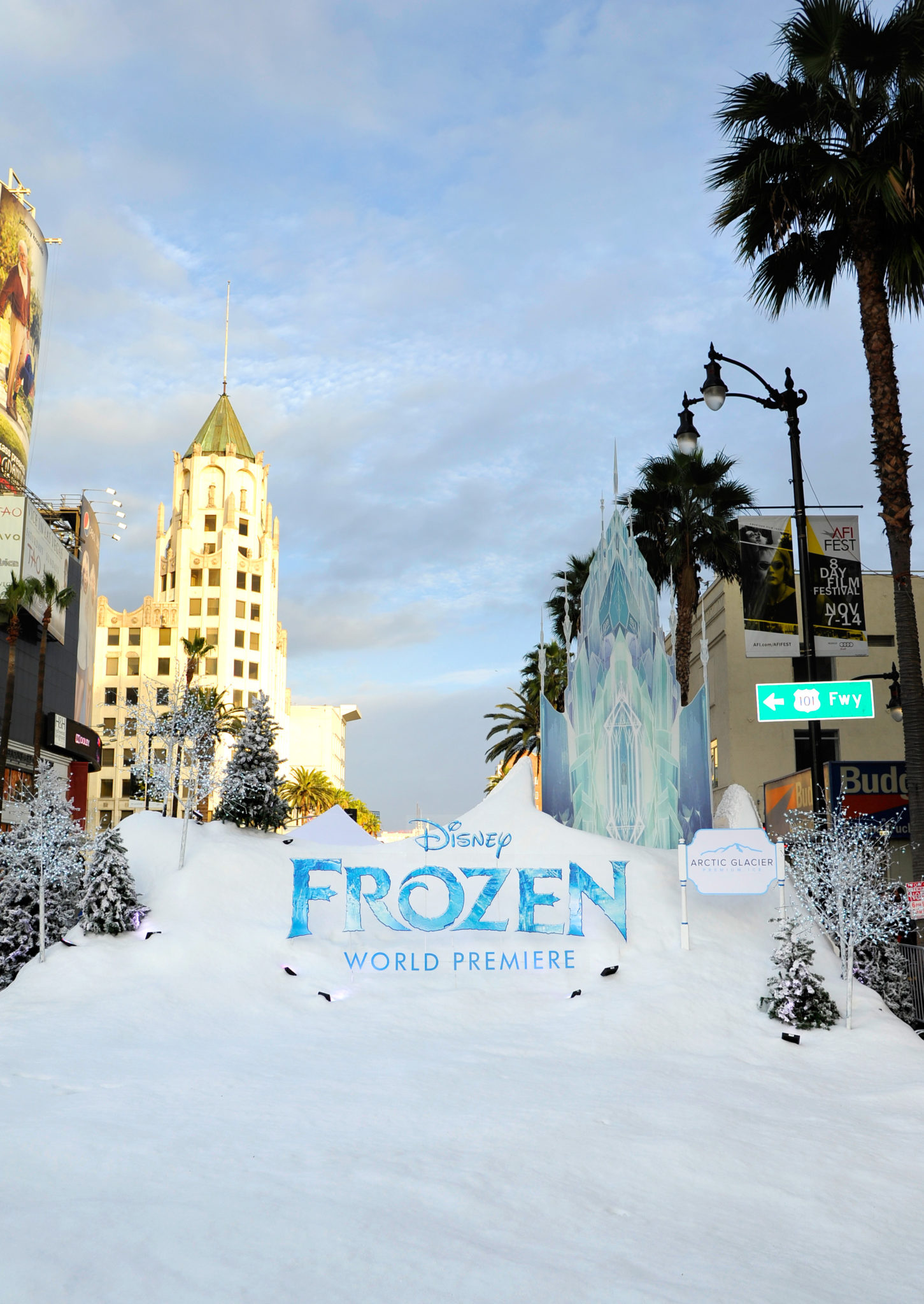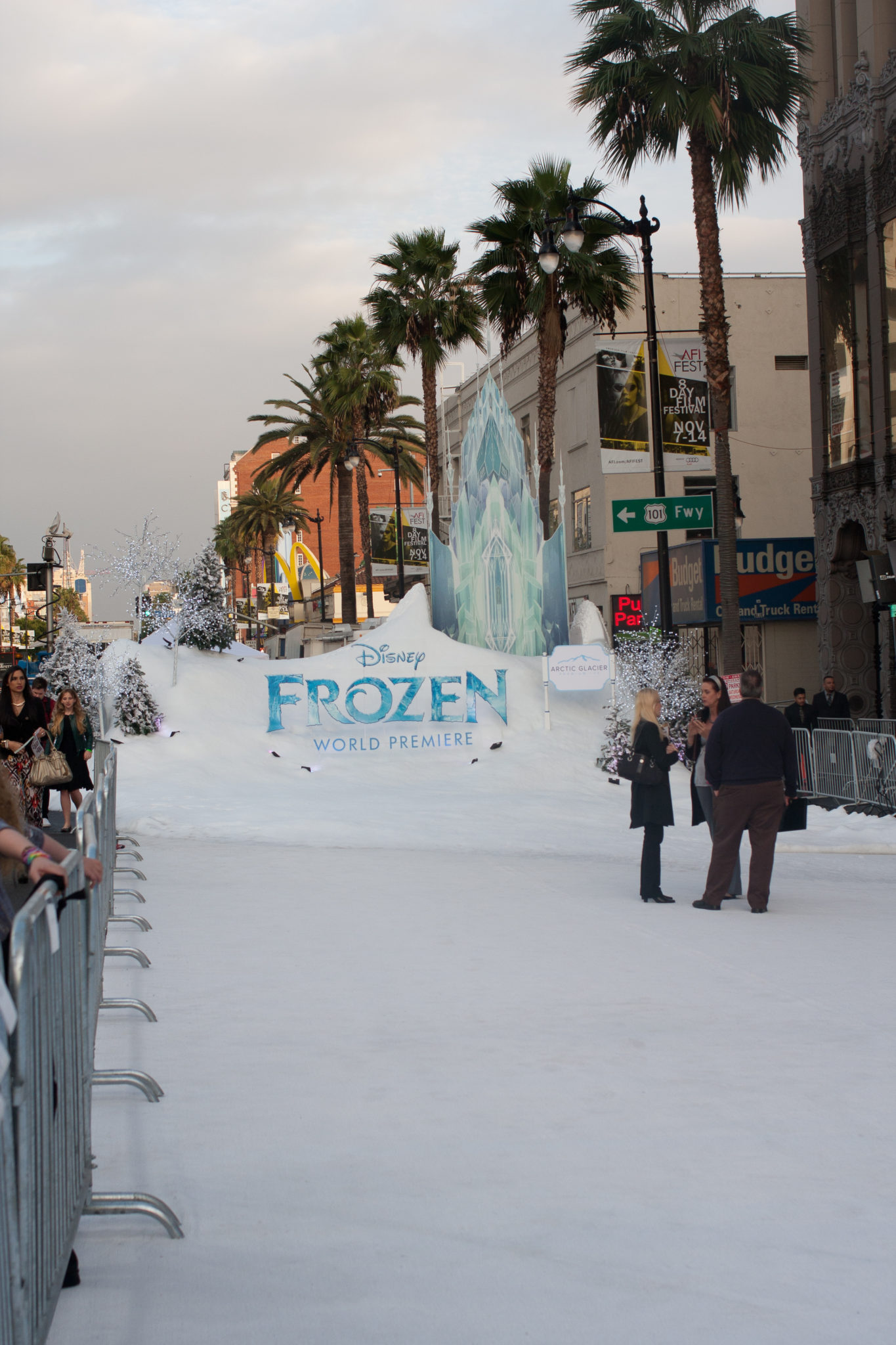 Looks like Elsa visited Hollywood and unleashed an icy storm because the red carpet was covered in snow! Hello, white carpet! There was big mounds of snow flanking both side of the white carpet, with marquees that said “Frozen World Premiere.”