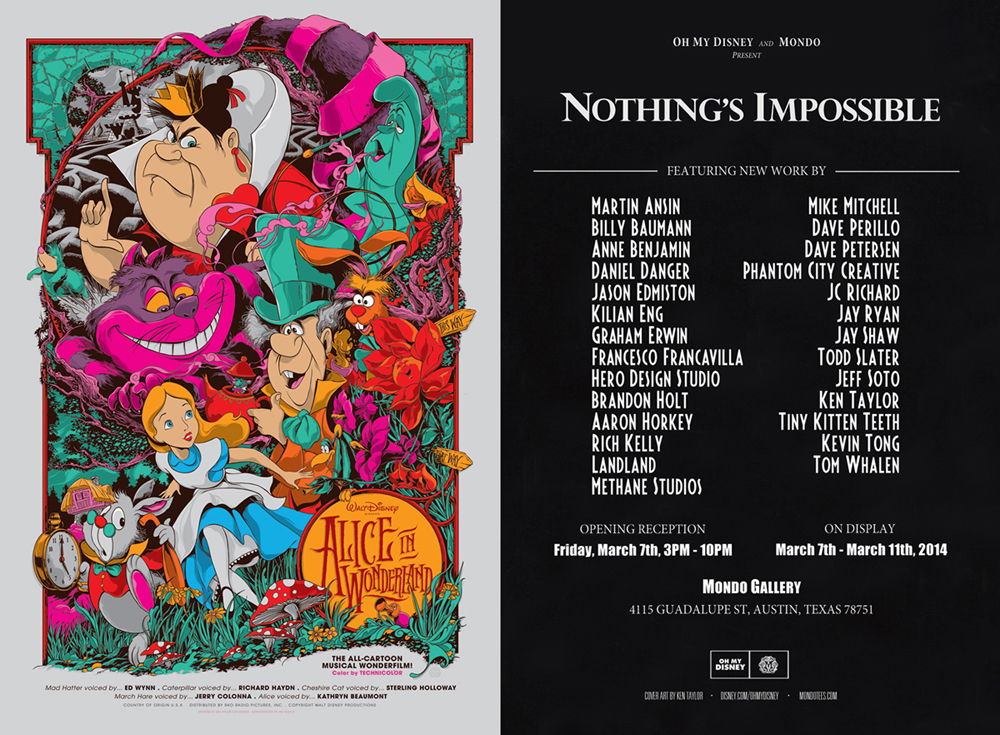 Mondo, the prints and collectibles boutique of the Austin, TX Alamo Drafthouse, has teamed up with Oh My Disney for an art show opening on March 7th called Nothing’s Impossible, as part of the SXSW film and music festival.