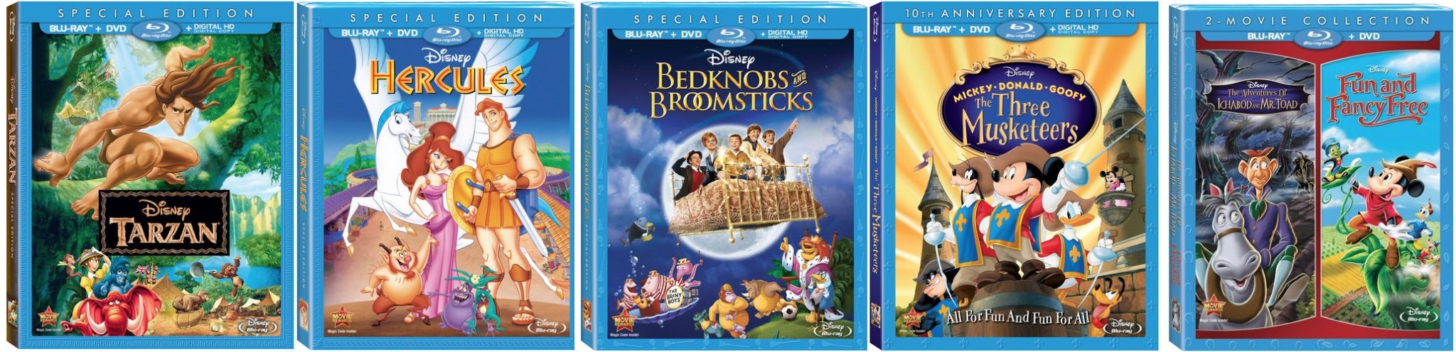 Disney released a boatload of new Blu-rays on August 12. And by boatload, we mean five Blu-rays were released for various Disney films including Tarzan, Hercules, The Adventures of Mr. Toad / Fun and Fancy Free (2-movie combo), Bedknobs and Broomsticks and The Three Musketeers.