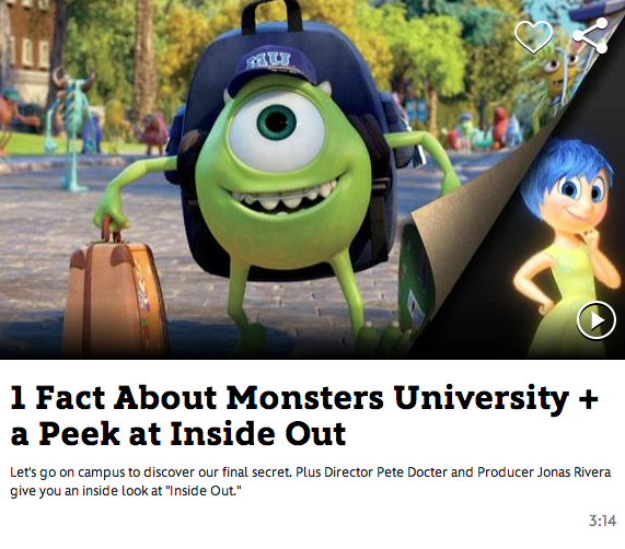 The clip was tied to the called the Pixar Summer Movies to Go! promotion that Disney Movies Anywhere has been running all summer; part of this included some exclusive bonus videos called the “Pixar’s Ultimate Countdown of Secrets”. Each week for 14 weeks, the site would release a short video detailing a few secrets found in each of Pixar’s 14 films. This week’s video rounded off the series with “1 Fact About Monsters University + a Peek at Inside Out.”