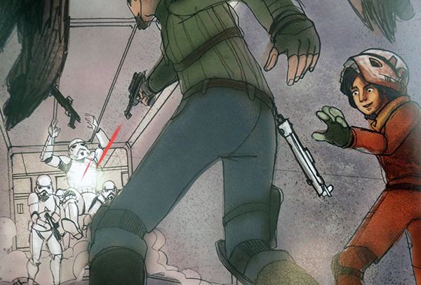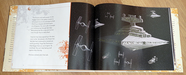 While it’s obviously not a comprehensive “Art of…” kind of book, there is plenty of art highlighting the Ezra, the crew of the Ghost, and the Imperial baddies. There is also some beautiful concept art featuring Lothal, the Outer Rim planet where Ezra lives. All of the pieces of concept art are cleverly disguised as book illustrations. There isn’t a lot of variation artist-wise and some of the designs are from early pre-production and don’t resemble the final product (not necessarily a bad thing). I’m still debating whether Lucasfilm was being smart or just lazy with this book.