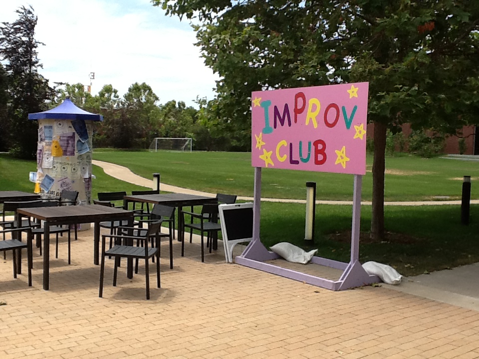 Beyond the fangirl thoughts drumming through my mind, my professional writer’s mentality kicked in and absorbed the other details. The week prior to my arrival, Pixar had hosted a large PR event for Monsters University. They had decked out the studio and campus as if it were a real college orientation day for the pretend scare school. There had been information booths, scare-leaders, and other activities. The remains still littered the area beneath Luxo’s unblinking gaze. Two things that I enjoyed the most were a replica of MU’s gate and a circular kiosk with fliers for campus happenings. I almost took a flier as a souvenir, but my morals got the better of me.