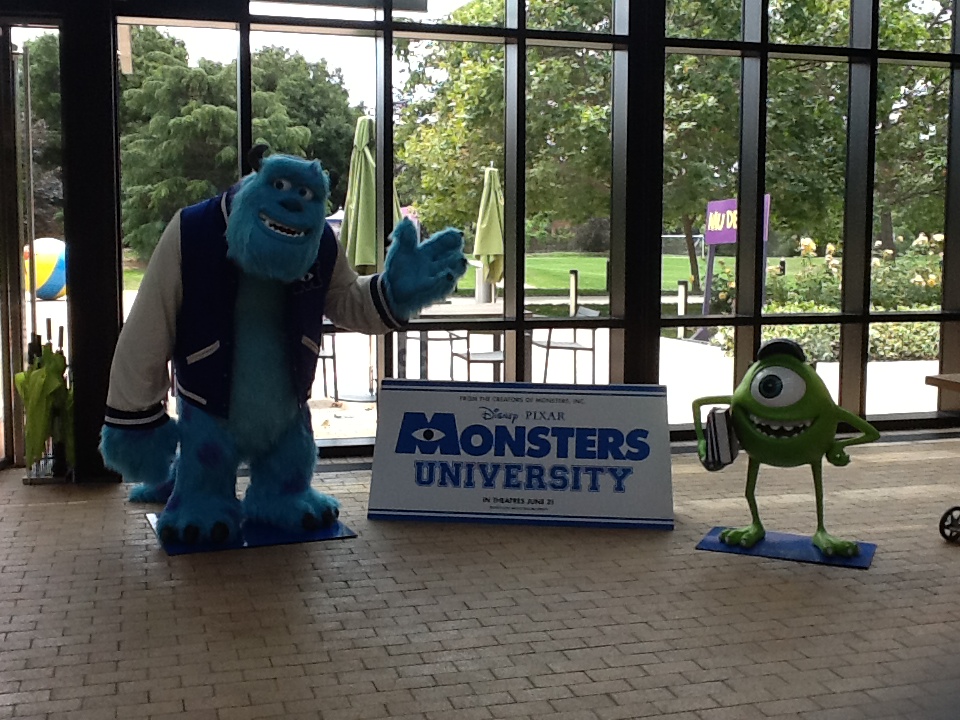 How did my adventure begin? After I discovered a news link for a live eBay auction for the tour, I won a spot on a Pixar tour with a special viewing of The Blue Umbrella, which the film’s director had donated to the local school district. It was March when I won the auction, so for three months I bided my time by arguing with customer support people in India about rerouting my vacation to San Francisco. They lost, I triumphed, but I am sure we shall meet in battle again. Time ticked by, until summer premiered on the horizon with rain, humidity, and advertisements for Monsters University. My tour was scheduled days before the summer blockbuster’s opening, making it even cooler to kindly brag to friends about where I was going.