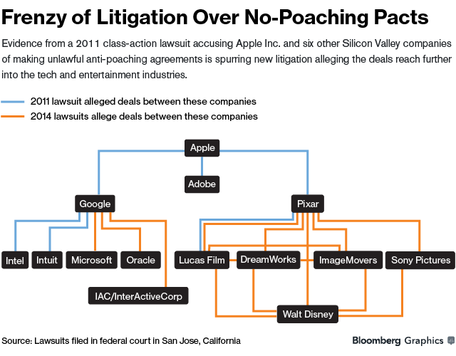“Pixar President Edwin Catmull acknowledged the use of such agreements when he was questioned by lawyers for thousands of employees who sued his company, along with Apple, Google and four others, in 2011. An unapologetic Catmull said he was trying to help the industry survive by stopping hiring raids, remarks that triggered a trio of complaints in the last three months against animation studios in California.”