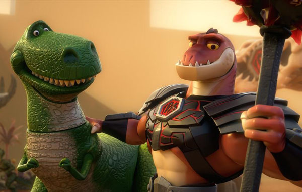 Trixie, having grown up in a mostly improv household with Bonnie, realizes she’s not meeting her full potential as a dinosaur. When other toys get selected to play dinosaur parts, that’s the last straw. But, one day, Bonnie gets invited to her friend’s house for a play date. However, her friend – Mason – is no longer interested in toys, but instead plays video games all day. Bonnie tosses her toys aside and begins to spend the day vegging out in front of the console with Mason. This is when Trixie and the toy gang meet the Reptillus and the rest of the Battlesaurs and immediately start suiting up for battle. While Trixie is busy flirting with Reptillus, a muscly, hunky dino, Buzz and Woddy are taken hostage by some of the other Battlesaurs.