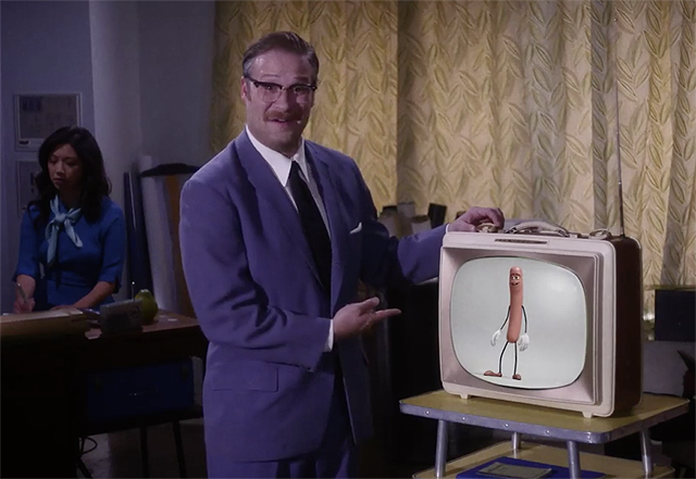The new promo is a clear parody of the televised show Wonderful World of Disney where Walt Disney himself would take you on a behind the scenes look of his latest movie. Seth Rogan – who wears a suit and glasses (and even a moustache) similar to Walt – begins a conversation with the animated sausage, Frank, but things take a dark turn.